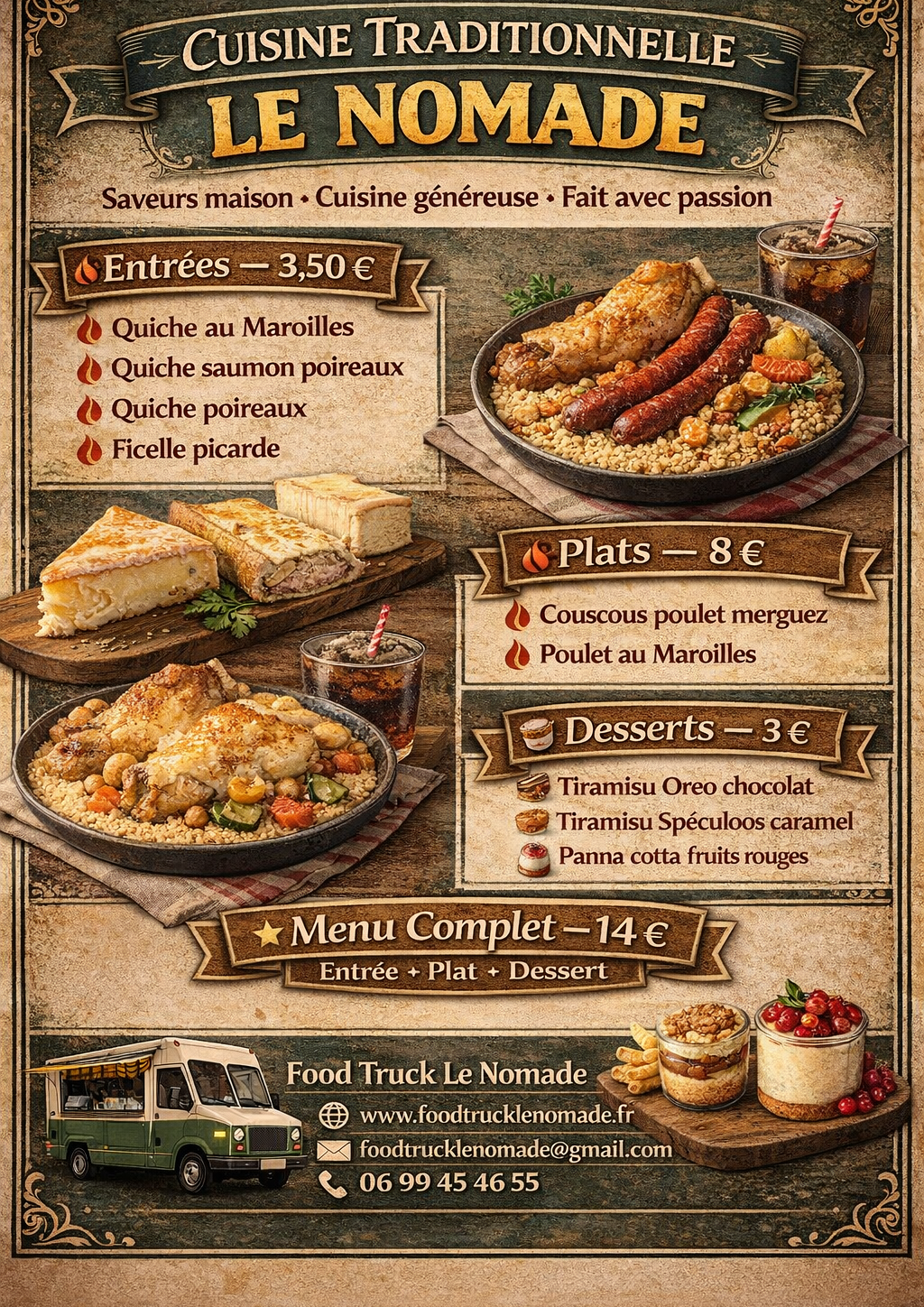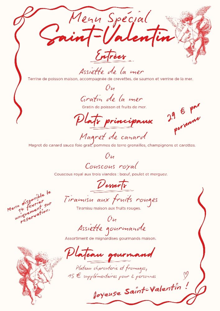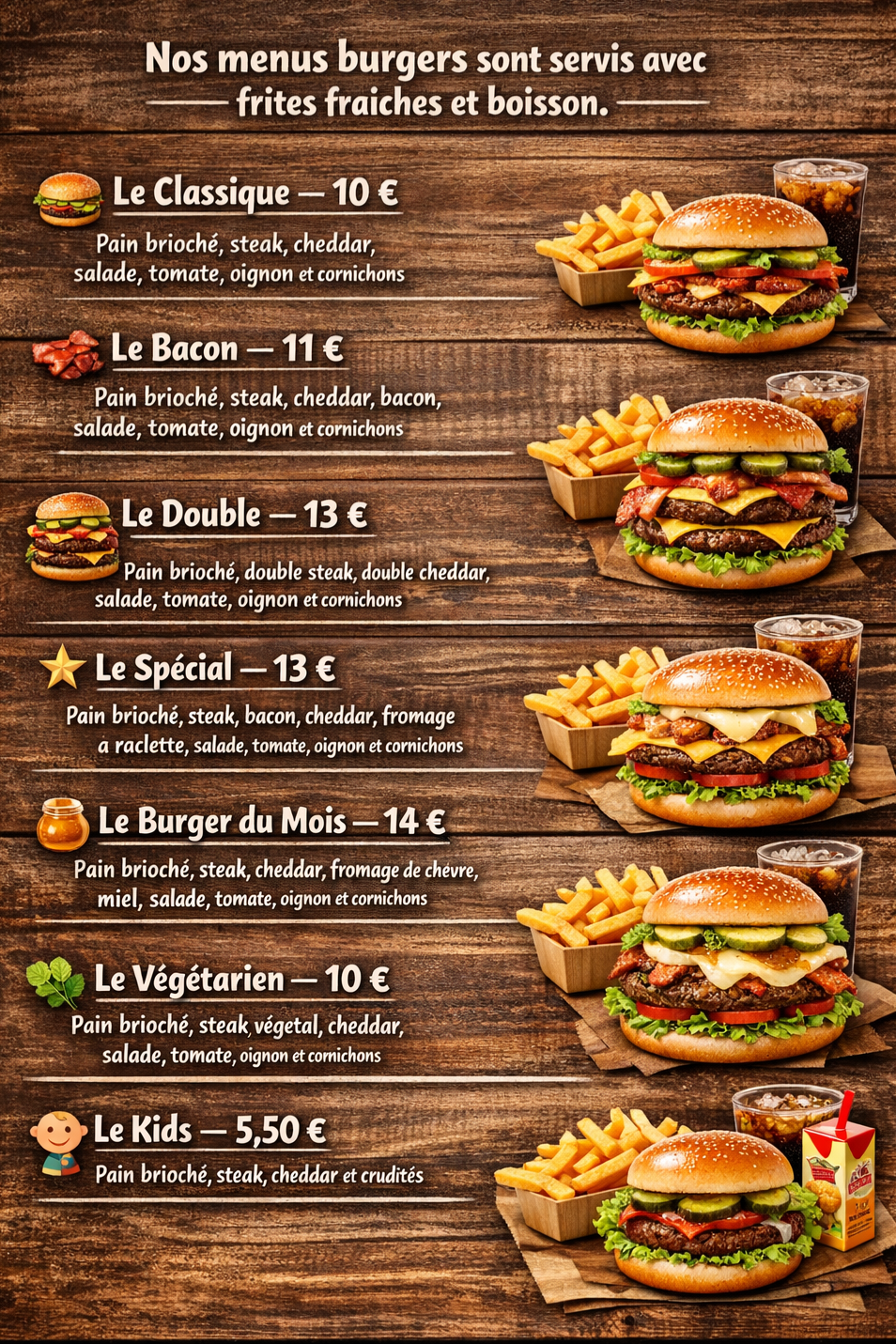 Notre menu change souvent, n'hésitez pas à rejoindre nos réseaux sociaux pour plus de précision.